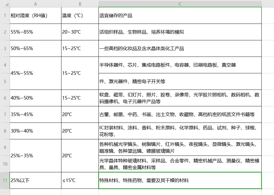因此很多廠商在大量長(zhǎng)期儲(chǔ)存物品時(shí)就會(huì)使用到控溫控濕柜,那么控溫控濕柜主要用于儲(chǔ)存那些物品。物品儲(chǔ)存的溫濕度因?yàn)楫a(chǎn)品的不同而各有不同。顯然大量不同類型物品同時(shí)儲(chǔ)存在一起顯然是不行的,需要須分別類對(duì)應(yīng)溫濕度范圍各個(gè)分開(kāi)存放,其溫濕度范圍也應(yīng)該單獨(dú)各自設(shè)置沒(méi)辦法一概而論,下表詳細(xì)的列出了部分常見(jiàn)需要嚴(yán)格保存的物品對(duì)應(yīng)的控溫控濕柜設(shè)置的溫濕度控制范圍,在操作中可以適當(dāng)參考。更重要的是根據(jù)物品本身說(shuō)明來(lái)進(jìn)行存放而不是無(wú)腦想當(dāng)然進(jìn)行存放